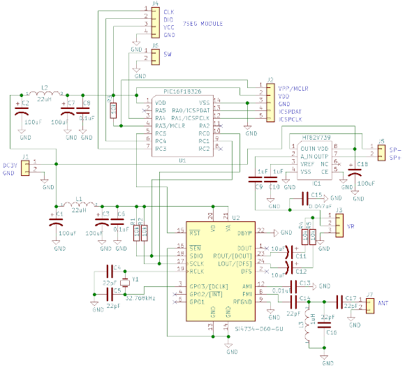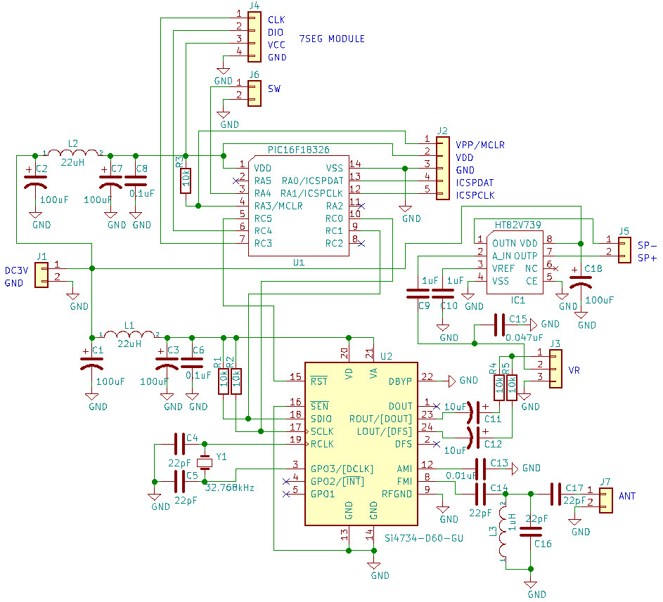 | 回路図を示します。過去にFMラジオ用に作った基板を流用しています。 | |