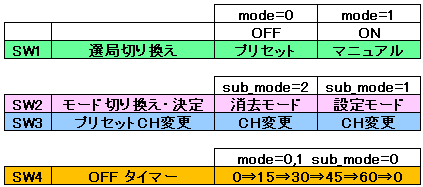 | SW4を押す毎にオフタイマーの時間を15分ずつ増加するようにしました。最大時間は60分です。オフタイマー機能を解除するには、オフタイマーの時間を0にして下さい。液晶の画面表示にオフタイマーの機能を追加しました。 | |