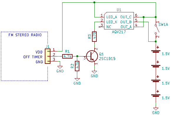 | Photo MOSリレーを電源スイッチに並列に取り付けて、FMステレオラジオのマイコンからコントロールすることで、オフタイマーを実現します。もちろんオフタイマーが動作している時には物理的な電源スイッチはOFFにしておく必要があります。現物を改造してオフタイマーを実現しようとしているので、その辺りはご理解下さい。 | |