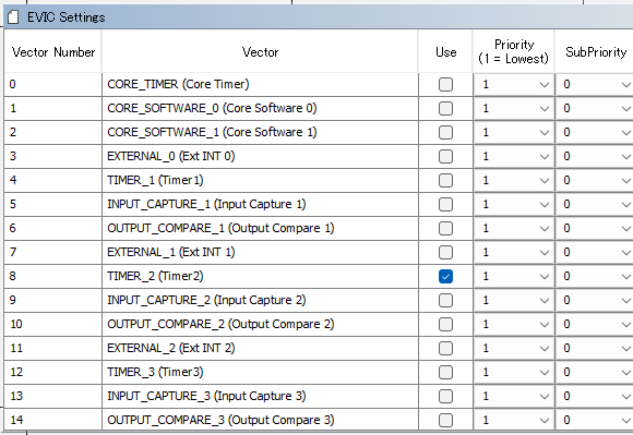| マイコンはPIC32MXを使用していますが、FMステレオラジオではマイコンの高速化は必要ないのでクロックは8MHzとしています。タイマー2のクロックには1/256したものを使います。そしてタイマーの周期は2秒とします。まずはここで引っ掛かりました。私の勉強不足かもしれないですが、タイマー割り込みはどうやら両エッジで掛かるらしく、1秒毎にカウントをするにはタイマー設定は多分そうなります。 | |
