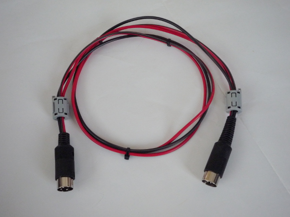 | 電源の取り出しは3pinのDINコネクタを使います。3pinを間違えないように挿せば良い訳で、DINにこだわる必要はありませんが。両端にはクランプコアを嵌めてみました。 | |