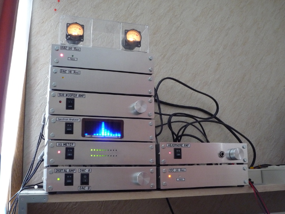 | ヘッドフォンアンプユニットは上図のようにDAC2とデジタルアンプの間に接続しています。DAC2は自作ですので、自作の音を思う存分楽しむことが出来ます。その使用感としては、まず無音時にノイズを全く感じることがなくとても静かです。その中で聴こえてくる音はとても素直に聴こえます。このICを使用されている皆さんが感じておられることと同じように高音はとても明るく感じます。また低音も豊かです。ボリュームは少し控えめのほうが良いかもしれません。まだひとつのヘッドフォンでしか聴いてきませんので、他のものでも試したいと思います。この製作、作って大正解でした。皆さんもトライしてみて下さい。 | |
