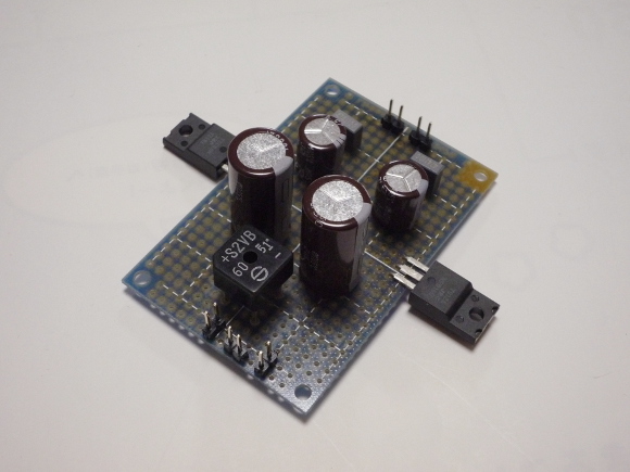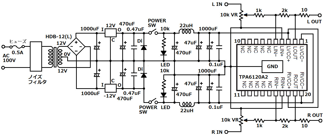 | ACを整流して±12Vを出力する電源回路を構成します。電解コンデンサは低インピーダンス品を使用しています。 | |