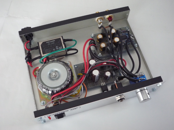 | 中身の配置はとてもシンプルになりました。AC系のはんだ付け部分は熱収縮チューブで絶縁しています。特にAC100V側の配線がひとつ余っているはずです。この線はしっかり絶縁しておきましょう。入力のRCAジャックは絶縁タイプを使っています。出力のヘッドフォンジャックも絶縁タイプです。ケースへのアースは必ず一点アースでお願いいたします。ボリュームはオーディオ用で少しの贅沢です。 | |