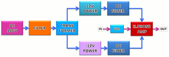 | 今回は判り易いように全体の回路図を示します。小さくて判りにくいと思われる方は回路図をクリックして頂くと大きいのが見れます。今回の特徴は電源回路まで含めて同じケース内で一体化したところです。新しいオーディオルームでも映えること間違い無しですね。ということで、いつものケースに入る薄型のトランスを探す必要があります。ここは思い切って共立で購入することが出来るオーディオ用のトランスを使用しましょう。 | |
