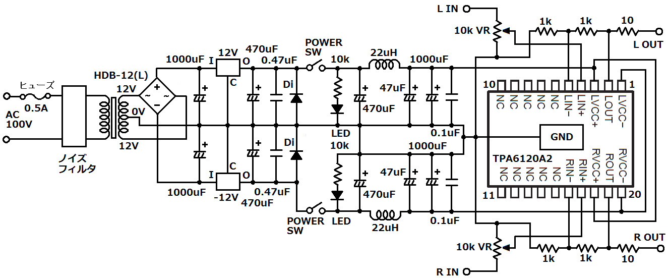 | アンプの配線を一部変更しました。簡単です。ヘッドフォンアンプICの使い方を反転増幅から非反転増幅に接続を変えました。 | |