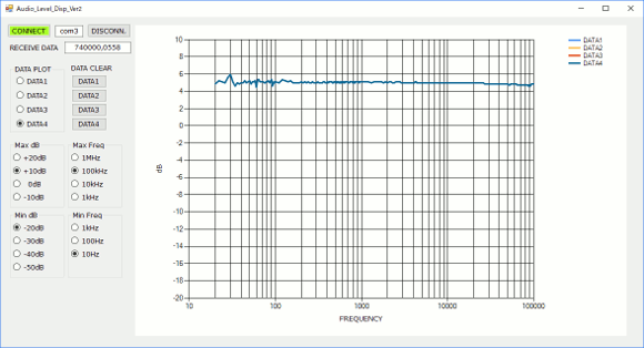 | 縦軸の絶対値はあまり気にしないで下さい。入力波形の振幅によって変わりますので。如何でしょうか。フラットな特性でとても満足しております。 | |