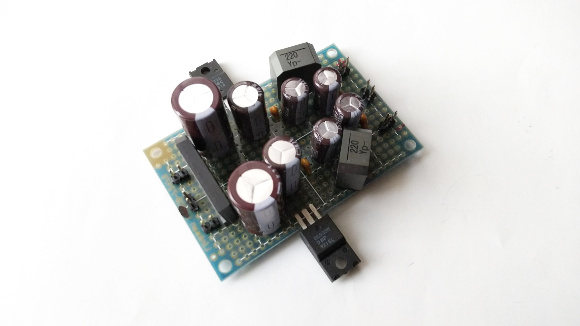 | 電源回路基板です。整流と±12Vの電源回路を構成します。DCフィルタ回路を搭載して、電解コンデンサは低インピーダンス品を豊富に使用しています。オーディオ回路には必須です。 | |