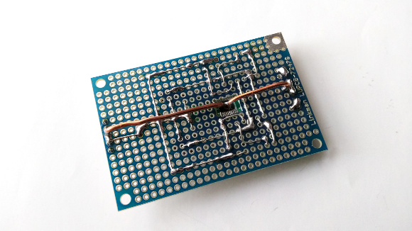 | ICのGNDは太目の銅線をはんだ付けして接続します。ICの発熱をこの銅線から逃がすことも期待しています。(すみません上の写真は配線の途中です) | |