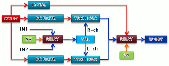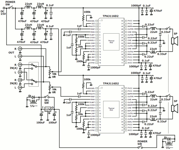 | アンプを置き換えですので、同じように入力系を2系統設けています。切換えスイッチでリレーを切換えて入力を選択しています。リレーを入力部付近に配置することで、切換えのロスを無くしています。電源回路のノイズフィルターはL/R用それぞれに独立しています。電源周りからのノイズをを極力抑えています。アンプはBTL接続で使用していますので、基本的には電源ON時のポップアップノイズは発生しません。しかし電源OFF時にボツ音が出ます。これを防ぐ為にスピーカー接続の部分をリレーでON/OFFしています。電源スイッチは2系統が同時にON/OFF出来るものを使用します。アンプICには今回DC15VのACアダプターを使いましたが、ICのスペック的には24Vもものでも大丈夫と思います。切換に使用するリレーはDC12Vタイプですので、12Vのレギュレータで定電圧化しています。リレーは大電流が流せるパワーリレーを使います。入力ボリュームはオーディオ用の高級品です。 | |