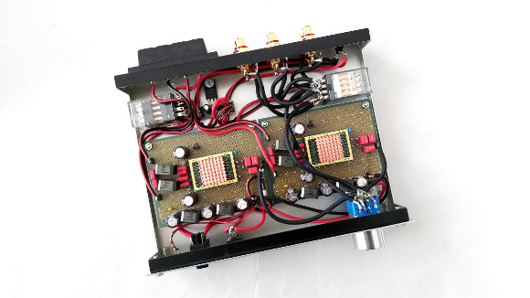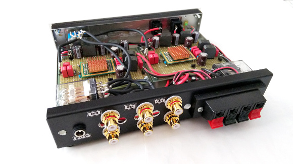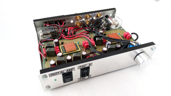 | 入力が2系統、選択した入力をそのままスルーする出力が1系統あります。オーディオルームAのメインアンプをこれに置き換えます。どのような音が出るかはこれからじっくり色んな音楽を聴いて感じることにします。まずは無事に製作が完成したことをお伝えいたします。楽しみですね。 | |