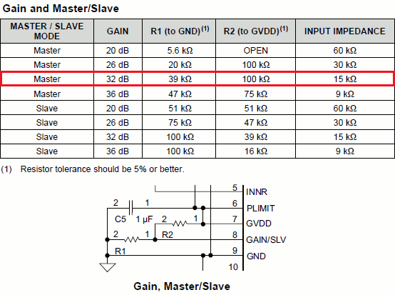 | 少し変わったICのようでマスター・スレーブの設定が可能ですが、マスター側に設定します。ゲインは抵抗値で設定します。上図を参考にして下さい。 | |