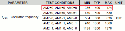 | 3つの端子を使用して発振周波数を設定することが出来ます。今回は標準の400kHzとしました。問題はないと思います。 | |