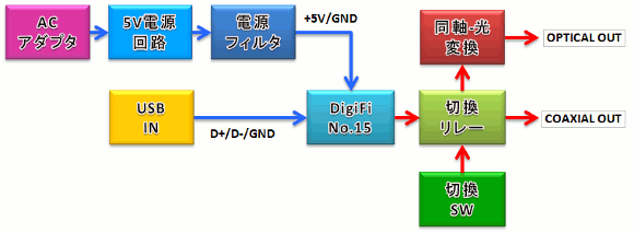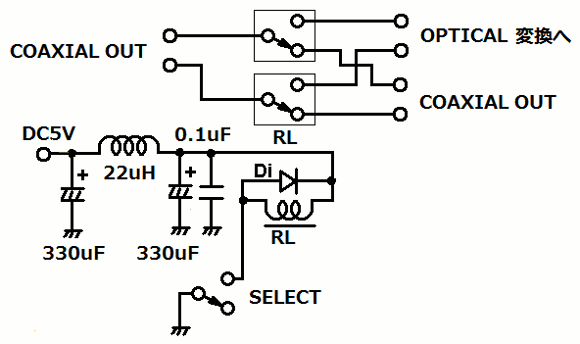 | 上図のようにUSB-DDCの出力はコアキシャル(同軸)とオプティカル(光)の2系統あって。それぞれ別のDACに接続しています。それらの出力は、システム上、同時出力とはしておらず、切換えて使うようにしています。今回この出力を切換えにあたり、信号線をスイッチでダイレクトに切換えるのではなく、リレーとスイッチで切換えるようにしました。 | |