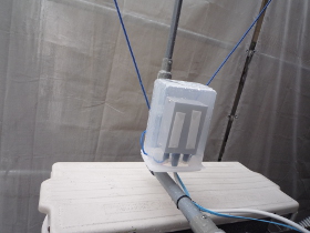 | アンテナ部は100均で買ったタッパに入れて防水をしています。雨風に耐えながら活躍中です。今はこのアンテナしか立てていません。短波と中波にはこれで充分ですね。 | |
