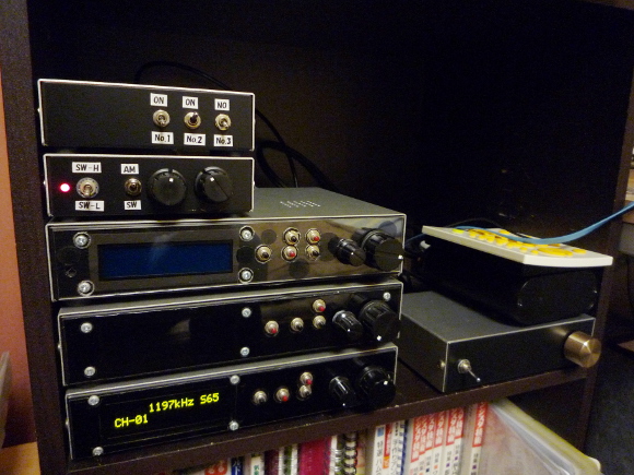 | 上から「アンテナ切換えBOX」「ΔLOOP7コントローラ」「短波ラジオ」「FMラジオ」「AMラジオ」です。(右側はUSB-DACとD級アンプですね) | |