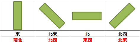 | 上図はアンテナを上方向から見た図です。例えば左端の図はループ開口を東(黒字表記)に向けることを記しています。そうすると指向性は南北(赤字表記)に現れます。1回ループの時にはあまりわからなかったのですが、この3回ループでははっきりと受信状態に表れました。私の住む所からループ開口を北に向けると指向性が東西になり韓国局が強力に入る状態になります。従って上図の4方向を駆使しながら全局制覇を達成しました。前回受信が出来なかった1233kHzの長崎放送も今回なんとか受信出来ました。 |