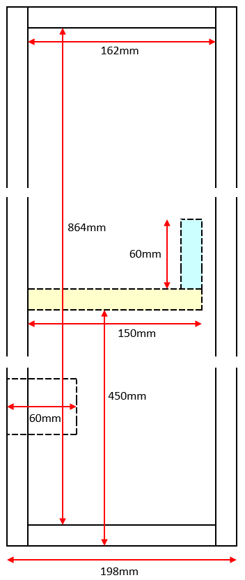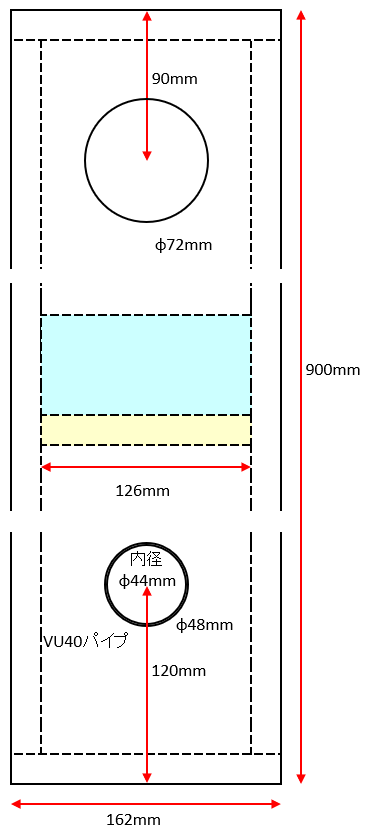 | 高さ900mmのフロア型です。上図は長手方向の一部をカットして図面表示しています。板厚は18mmですので、かなりしっかりした作りになります。ダブルバスレフですので、内部にもバスレフポートがある構造になります。 | |