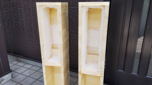 | 上部のスペースの内側に吸音材を貼り付けます。私は手芸店で購入出来るクッション材のシートを使用しています。厚みも色々あるので好みで選んで下さい。スピーカー端子を取り付ける部分の内側には決して貼らないように。間違って張り付けるととんでもないことになります。 | |