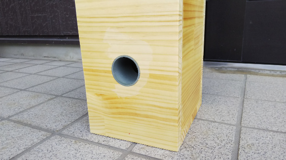 | 塩ビパイプのバスレフポートは簡単に仕上げるために使用していますが、外観的にはもう少し工夫したほうか良いのかなと思うこの頃です。まずはひとまずこれでOKとしましょう。 | |