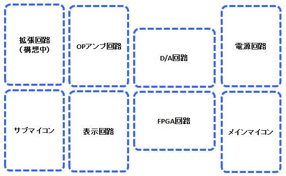 | 少し大きめのケースを使用してFPGAを中心に各基板を配置しています。基本部分は確認が終了していますので、少しずつ完成に近づけていきたいと思います。 | |