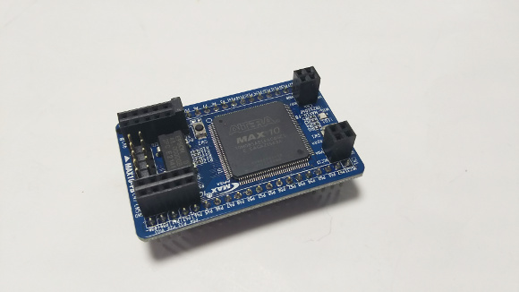 | ここまで組み込むとピン数の少なさがネックになってきます。このMAX10ボード上のFPGAには沢山のピンが出ていますが、実際にボードから取り出すピン数には限りがあります。このボードの裏側にはSDRAMが接続されています。私はこのSRAMは使っていませんので、これに接続されているピンを使いたいところですが、基板外に取り出すのは困難です。ということで、不足する機能については外部にマイコンを置いて補完することにしました。現在の開発状況をお見せします。 | |