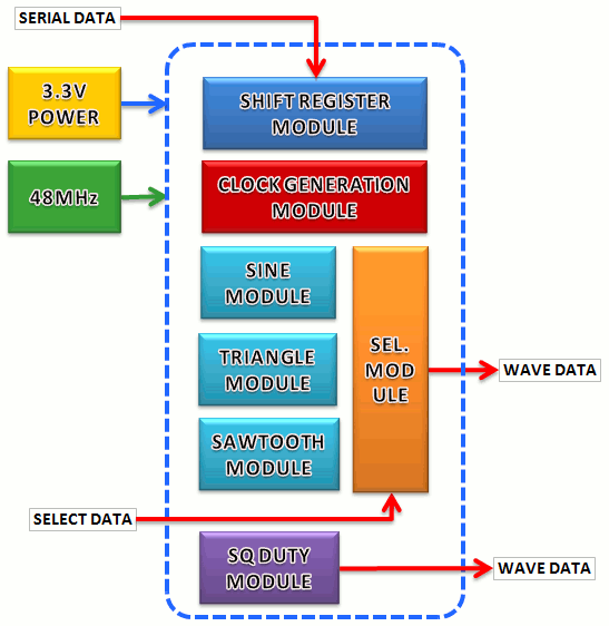 | 正弦波発振器と周波数カウンタを組み込んでも使用ロジックは数%程度です。さすがにこれではもったいないので工夫をすることにします。発振器は複数の波形を出力出来るようにします。今回は正弦波の他に三角波、ノコギリ波、方形波を出力出来るようにしました。合わせて方形波はデューティも可変出来るようにします。帯域はオーディオ用として使う範囲で、前回の製作よりも高い周波数まで出力出来るようにしました。実際には374kHzまで出力します。ここまで出れば趣味のオーディオ用には充分と思います。 | |