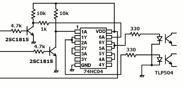 | 正弦波スイープで測定したデータはクロック信号とデータ信号で出力します。これを一旦光信号に変えてPC側と分離します。過去の製作でもこの方法を使ったことがあります。上図回路を構成することでステレオ音声ケーブルで接続することが可能になります。 接続ケーブルに関する過去の記事: 4機器接続スリープタイマーを作ろう |
