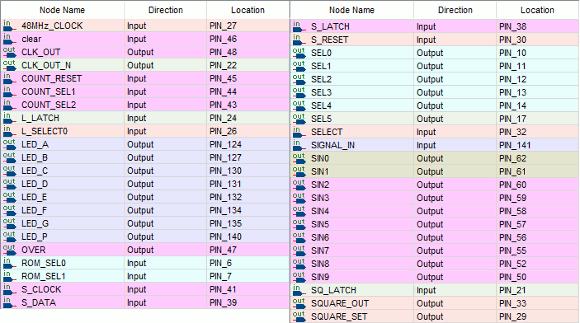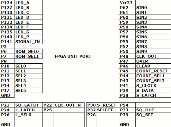 | この機器の製作に関する全てのプログラムソース、VBアプリ、エクセルのファイルなどは次回の記事で公開させて頂きます。もう少し使いこなしの事例なども紹介出来ればと考えています。FPGAに関するポートの割り当てを今まで載せることが出来ませんでしたので以下に記載いたします。 | |