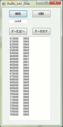 | データを受信するとテキストボックスに順次周波数と測定データが表示されます。受信ごとにクリップボードにデータをコピーするので、このソフトを起動中は他のアプリでペーストなどを行うことは控えて下さい。データのコピーは「データコピー」ボタンをクリックすることでマニュアルで行うことも出来ます。 | |