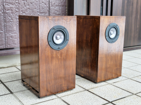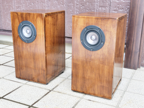 | なかなか良い仕上がりになりました。ディスクトップ型で作りましたが、フロアに置くことも考えてユニットを取り出した前のエンクロジャーは改造してスピーカー台として生まれ変わりました。 | |