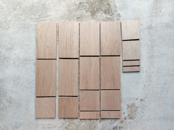 | 基本、過去に2度作ったディスクトップ型のダブルバスレフと同じ設計とします。早速、ホームセンターに合板の下見に行きました。なな!なんと、15mm厚の合板が無い!!!なんということでしょう。世の中、どうなっているのでしょうか。家に帰って、緊急で12mm厚で設計し直ししました。数日後、板取り図面を持ってホームセンターで購入そしてカットサービスを利用しました。 | |