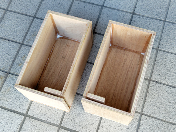| 2回塗装後、#400の紙やすりでで更になだらにして、再度2回塗装します。しかしここで問題発生。木目が綺麗に見えない。ということで急遽、塗り直しすることに。 | |