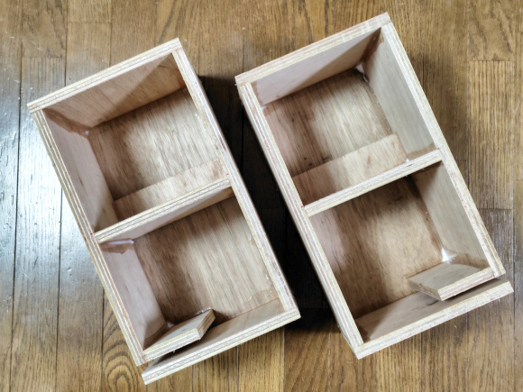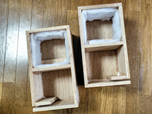 | 12mm厚のため壁が薄くなっています。その分バスレフダクトの長さを調整しています。後になって判ることですが、第一空気室と第二空気室を分ける合板の位置を来年の設計時に見直しが必要かもしれません。まあこの時点では判らないので、昨年までと同じ分け方にしています。 | |