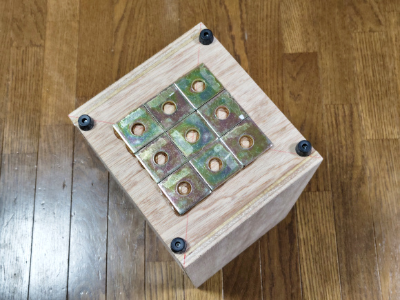 | 合板が今までの15mmから12mmになったことで、エンクロージャーの重さが軽くなりスピーカーユニットを取り付けることで全体の重心が不安定になるように思いました。よって重りとして使っていた金属ワッシャーをエンクロージャーの底面に貼り付けることにします。 | |
