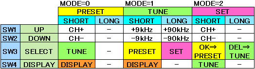 | バンク切換えは電源ON時に他のキー(SW1,SW2,SW3)のどれかを一緒に押すことで切換えるようにしました。消費電流とノイズ削減のため、周波数表示はすぐに消えます。そこで表示用のSW4を用意しました。このキーは設定モードから抜ける時にも使用します。 | |