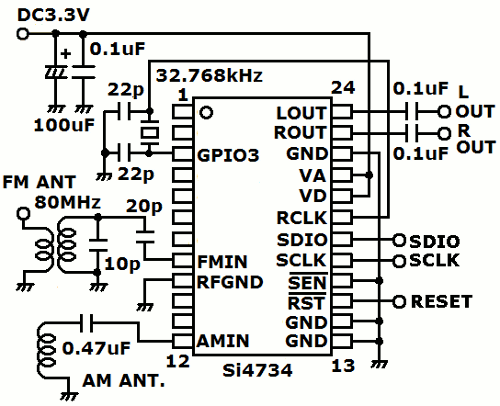 | このチップはAM/FM/SWラジオ用ですが、操作を簡単にするためにAM/FM用としました。 | |