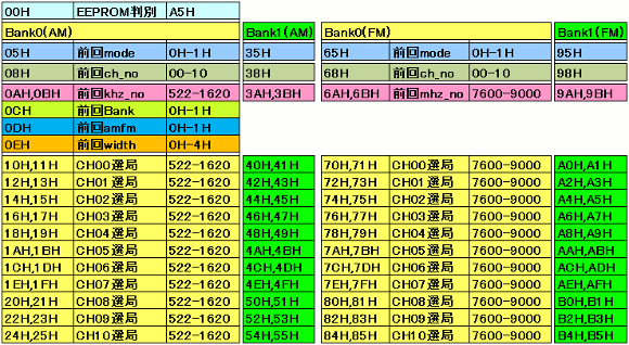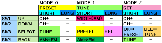 | 今回は操作を簡略化しています。プリセットとマニュアルのみです。基本操作としてはマニュアルで選局しながらプリセットしていく。通常はプリセットで聴く。という具合ですね。 バンク切換えは電源ON時に他のキー(SW1,SW2)のどれかを一緒に押すことで切換えるようにしました。AMモードのマニュアル操作時に限り受信帯域を切り換えることが出来ます。EEPROMに記録しますので次回電源ON時にも有効です。 |