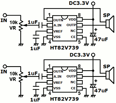 | 定番の回路ですね。表示モジュールからのノイズは確実に音声に現れます。表示側でしっかり防ぎましょう。 | |