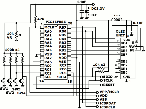 | OLED表示モジュールも直接駆動しています。正直このモジュール少し曲者です。電源ラインから大量のノイズを発生しています。電圧降下を犠牲にしてでもLCフィルターで電源回路からのノイズを防いで下さい。コイルの定数は皆さんで検討下さい。私は15mHとしました。ノイズはばっちり収まりましたが、直流抵抗値が大きく電圧降下が大きいかもしれませんね。またこのモジュールには昇圧回路らしき部分があります。ここから空中に出るノイズも防ぐ必要がありそうです。 | |