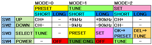 | バンク切換えは電源ON時に他のキー(SW1,SW2,SW3)のどれかを一緒に押すことで切換えるようにしました。操作は最近のラジオと全く同じです。私のラジオ操作の定番です。 | |