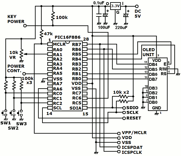 | OLEDの表示は3.3V駆動としました。制御は従来の液晶モジュールと全く同じ手順で可能です。この表示装置はクセになりそうです。共立エレショップで購入出来ます。 | |