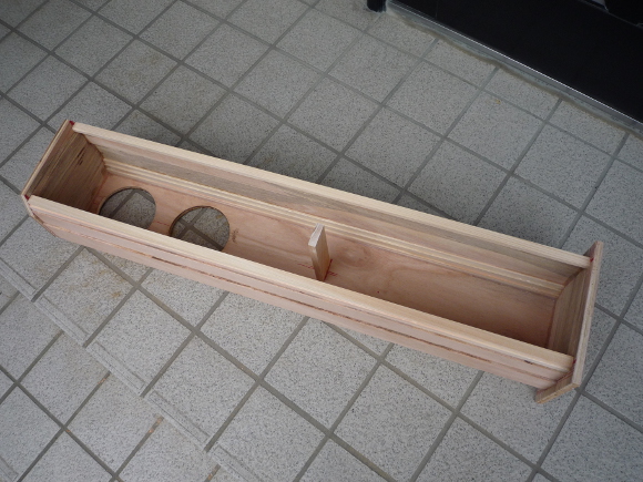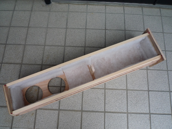 | 背面板ひとつ手前のヒノキは12mm角を使用すると背面板がはみ出ますので、ここの部分のみ9mm厚のヒノキを使います。9mm x 15mmのヒノキが使えると思います。今回は重低音の振動を気にして前面板と背面板との間に補強板を入れました。 | |