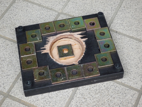 | ベース部はかなり汚いですが、前回の製作のものを裏向けにして使いました。錘となる座金を万能ボンドで貼り付けて、ゴム足を取り付けます。 | |