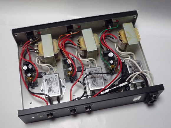 | 3台の機器に電源を供給するために全く同じ電源回路を3組構成します。電源を通してお互いに影響を受けなくする配慮です。(正直どこまでの効果があるかはわかりません) | |