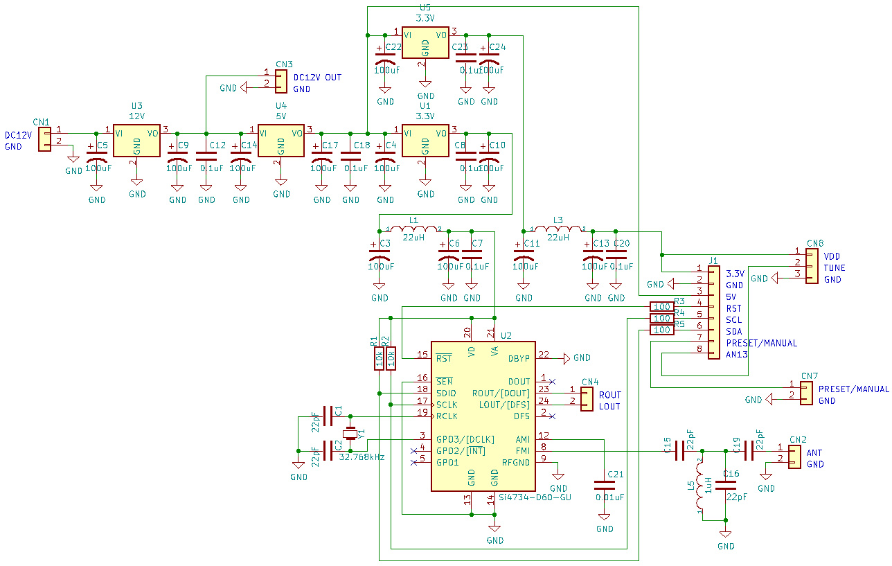 | 今回のチューナーの特徴を記します。 ・受信周波数は76MHz〜94MHz付近。(プリセットはそれ以上も可能) ・選局はマニュアルとプリセットが可能。 ・プリセット局数は12局。プリセットごとに自動ステレオと強制モノラルの設定が可能。 ・電源回路はフィルターを構成して回路ノイズを低減。 ・DSPチップは旧シリコンラボ製のSi4734を使用。(Si4735も使用可能) ・メインマイコンはPIC32MXを使用。 ・周波数と受信強度などの情報は128x128ドットのカラー液晶に表示。 ・DSPラジオ特有の高音出力ひずみはローパスフィルタで低減。 |