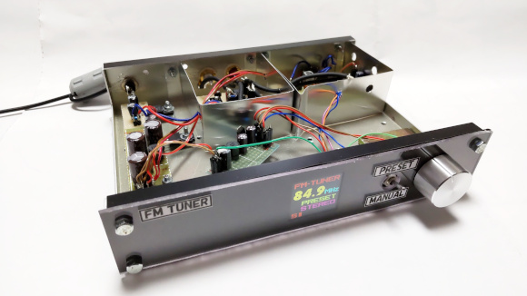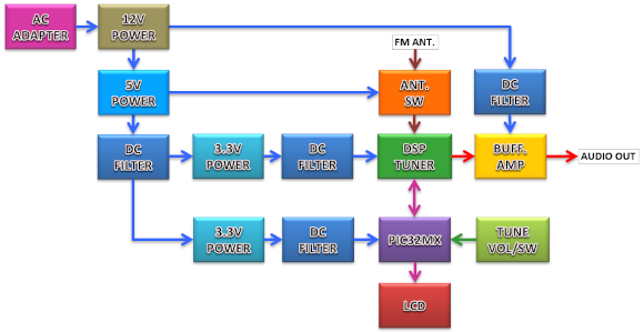 | 最近AM放送がどんどんFM放送に移行しています。今こそFMラジオなのです。今回はオーディオシステムに接続するということで、FMチューナーに仕上げました。今回製作したFMチューナーの内部構成です。 | |