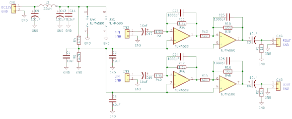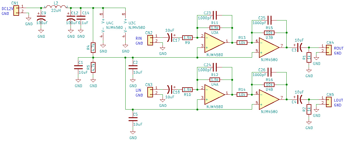 | DSPチップの音声出力部にローパスフィルタ回路を設けます。DSPチップの嫌な高音の歪を低減するための回路です。今回よりこの部分のOPアンプの電源電圧を12Vにしました。回路電圧を上げた効果があったかどうか正直わかりません。 | |