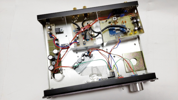 | 過去の製作品を改造しましたので、ユニバーサル基板を使っています。ローパスフィルター回路も今回新しくユニバーサル基板で組みました。一応、機能ごとにアルミ板で遮蔽しています。効果のほどはそれなりに。表示部分が大変すっきりと出来ました。回路のGNDは一点アースでケースに落としています。 | |