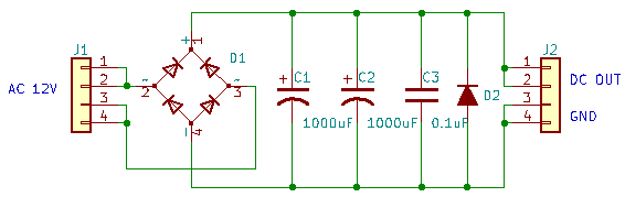 | 12V出力のトランスを接続すると、AC-DC回路の出力電圧は無負荷で18Vくらいになってます。動作時に16V程度ですから、後の回路にDC12Vのレギュレータを入れているので、丁度程よい電圧ですね。1000uFを2発かましているので、電圧も安定しています。トランスタイプのACアダプターと比べると遥かに良い状態です。 | |